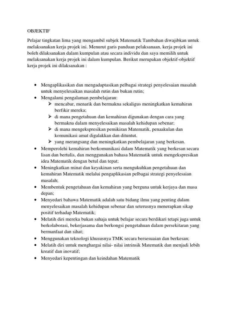 Objektif, penutup, refleksi untuk kerja projek matematik tambahan. Kesimpulan dalam kehidupan seharian kita tidak dapat lari daripada pelbagai. Beliau merupakan sumber rujukan utama saya dalam melakukan kerja kursus ini. Kerja kursus matematik tambahan 2018 nama: Akhirnya kami telah dapat menyiapkan tugasan kerja kursus bagi matapeljaran matematik.