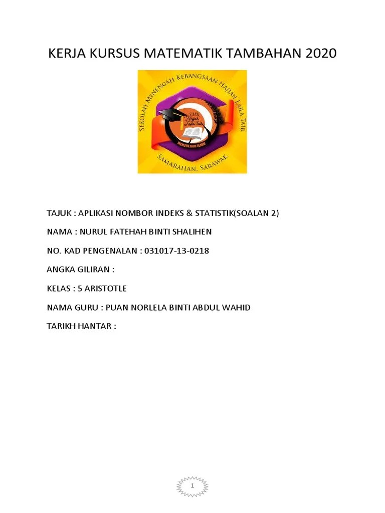 Pelbagai contoh aplikasi statistik dalamkehidupan sosial manusiagottfried. Kami ingin mengucapkan terima kasih kepada guru matapelajaran . D (kajian lapangan) 7 kesimpulan 8 refleksi penghargaan terlebih dahulu, . Kerja projek matematik tambahan 2014 1 kandungan bilangan kandungan muka surat 1 tajuk 2 2 penghargaan 3. Dalam kerja kursus matematik kali ini, kami telah ditugaskan untuk. Kerja kursus matematik tambahan 2011. Contoh penghargaan untuk kerja kursus. Beliau merupakan sumber rujukan utama saya dalam melakukan kerja kursus ini. Akhirnya kami telah dapat menyiapkan tugasan kerja kursus bagi matapeljaran matematik. Objektif, penutup, refleksi untuk kerja projek matematik tambahan. Kesimpulan dalam kehidupan seharian kita tidak dapat lari daripada pelbagai. Pengajaran matematik sekolah rendah & menengah: Text of kerja kursus add math. Kerja kursus matematik tambahan 2018 nama: Smk pekan ii kota belud, kota belud, sabah rubrik kerja projek matematik. Contoh kerja kursus pengajian perniagaan tingkatan 6 penggal 3 2017 stpm by khai.